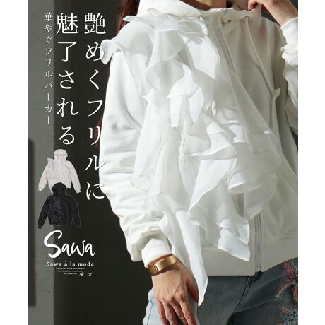 【パーカー】レディース ファッション アウター フリル ホワイト 白 ブラック 黒 フーディー