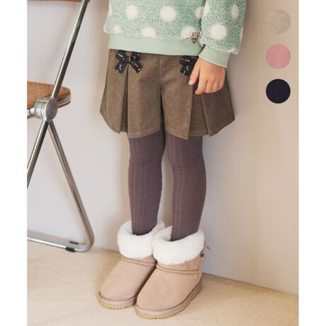冬らしいコーデュロイ素材のキュロット。正面についたロゴ入りのリボンがキュートなポイントです♪キュロットなのでアクティブに動いても安心!冬も元気に遊びたい女の子にオススメのアイテムです。寒い日にはタイツやハイソックスと合わせても◎。