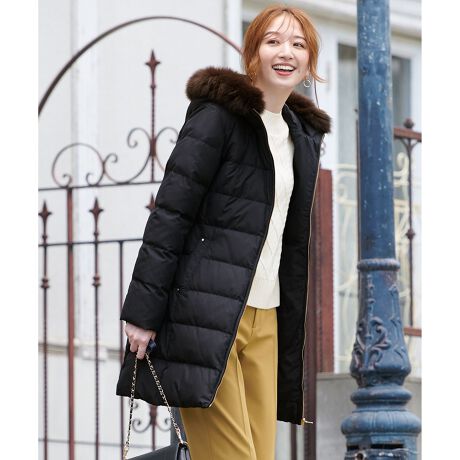 ■デザインフォックスファー付きのフードが顔周りを華やかに見せてくれる、上品なロングダウンミックスコートです。分量感やシルエット、ステッチのバランスなど細部までこだわり、着ぶくれして見えないすっきりとしたデザインに仕上げました。ファスナー部分の光沢テープがさり気ないデザインのアクセントに。車に乗る際など邪魔にならず、腰回りも覆う程よい長さの着丈も嬉しいポイントです。