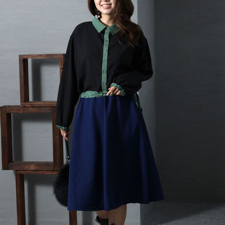 【大きいサイズ】配色切替えシャツワンピース 大きいサイズ レディース ワンピース ワンピ ミモレ 秋