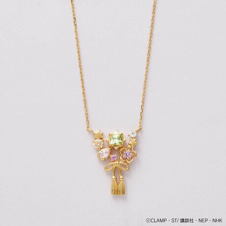 中央には、小狼くんの羅針盤モチーフがセッティング。衣装をイメージしたグリーンやオレンジのカラーストーンが輝きます。寄り添うように桜のお花モチーフとさくら色のストーンがデザインされ、ふたりの絆を感じていただけるジュエリーです。小狼くんの剣についている飾り紐が繊細にデザインされ、ポイントとなっています。
