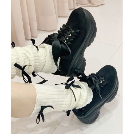 ボリューム感のあるサテンリボンと、かかととサイドのフリルデザインがかわいい厚底スニーカーです。