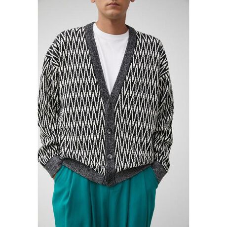 2023 Spring&Summer item・カシミヤタッチアクリルを多本取りでジャカード編みにして図柄を表現しています。・定番カラーの無地が圧倒的に主流のカーディガンだからこそ、柄を取り入れるだけでかなり新鮮になります。・コンパクトで細身なボトムスを選べば、全体のボリューム感のバランスが取れ、オシャレに見えます。・レトロ柄デザインは、トレンドライクなアイテムになります。