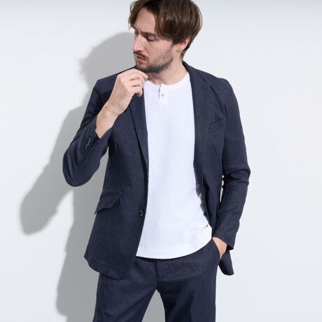吸湿性の高い再生繊維のレーヨン糸とプリッとしたコシを出すナイロン糸を使用したスラブデニム調のハイパワーストレッチ素材を使用。