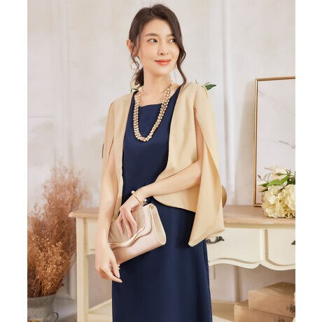 いつものパーティースタイルに手軽にトレンドをオンできるマントケープ風ボレロ。
