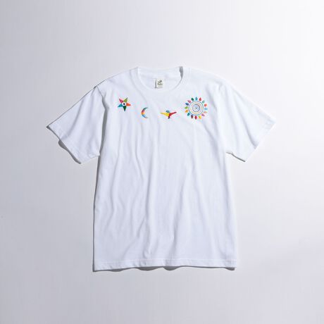星や太陽などのモチーフを色とりどりの糸で描いたエンブロイダリーがスタイリッシュなショートスリーブTシャツです。デニムシャツやパーカーを羽織っても、カラフルな刺繍が存在感を主張します。単調になりがちなサマーカジュアルに投入したいトップスです。
