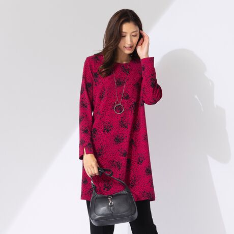立体感のあるふくれニットを使用した柔らかなチュニック。伸縮性に優れており程よい肉感も魅力の素材です。ドットをアレンジしたようなフラワープリントは着こなしやすく流行にとらわれにくい柄。