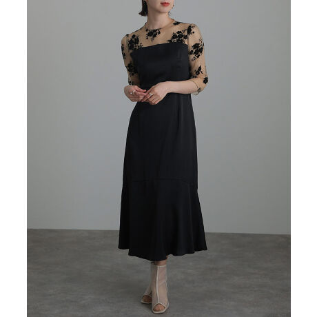 フロッキーフラワーデザインとサテンの上品な光沢が高級感のあるワンピース。
