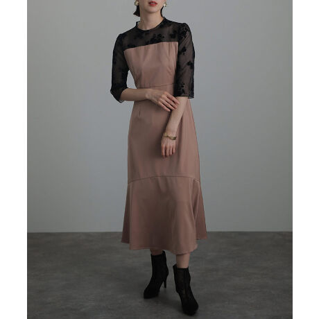 フロッキーフラワーデザインとサテンの上品な光沢が高級感のあるワンピース。