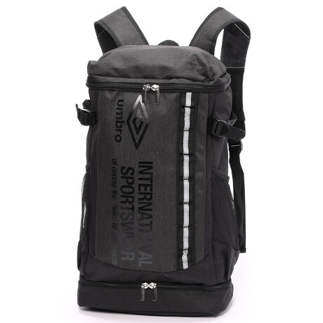 スポーツブランド<アンブロ>のスクエアリュック。メイン収納のポケットと靴やお弁当、着替えなど分けて入れることが出来る2層仕様です。内側はウレタン入りのポケットが付いておりパソコンやタブレットなども収納可能。外側にはペットボトルや水筒を入れるメッシュポケットや鍵や小物や使用頻度の高いものなどを入れるファスナーポケットもついているので非常に仕分けしやすいリュックとなっています。
