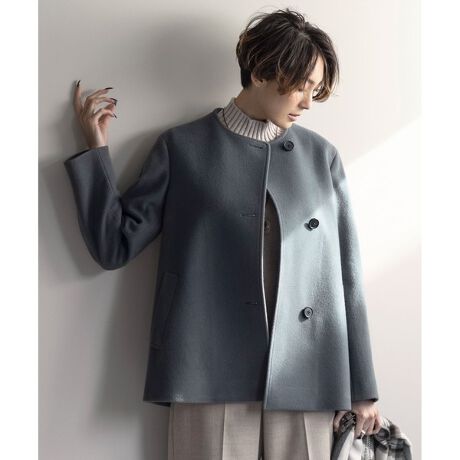 顔周りをスッキリと魅せてくれるノーカラーコート。スカートにもパンツにも合わせやすいミドル丈に仕上げました。厚手のニットを着てもごわつかないオーバーサイズのシルエットですが、女性らしさもあり釦を留めるときちんと印象に。スッキリとした首元でタートルネックのニットとも相性が良く、マフラー等の小物使いでコーディネートの幅が広がります。総裏ありです。
