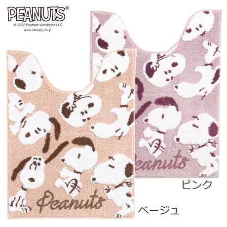 コミカルなスヌーピーの動きや表情のアートがユニークで楽しいデザインの大判トイレマット(約80×60cm)。フラッフィースヌーピー、PEANUTS。ふわふわのスヌーピーと一緒にホッと一息する可愛いデザインのシリーズ。裏面滑り止め加工の為、安心。洗濯機で丸洗いできるので、衛生的にお使いいただけます。