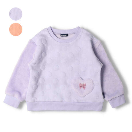 水玉模様のニットキルト素材の身頃にふわふわボアのお袖の異素材切り替えのトレーナー、スウェット。小さなリボンのモチーフの付いたボアのハートの形のポケットもポイント!どんなアイテムとも合わせやすい女の子らしいアイテム。(ベビーサイズのみ肩ボタン仕様になります。)【アイテム】長袖 ロングスリーブ トップス シンプル ガーリー フェミニン カジュアル お洒落 オシャレ かわいい 可愛い 普段着 デイリーウェア お出かけ着 お外着 お外遊び着 子ども こども 女児 女の子 ガールズ キッズ ベビーサイズ トドラーサイズ 幼稚園 保育園 小学校 通園 通学 小学生 2022年秋冬物新作 丸高衣料 ラベンダー 薄紫色 ライトオレンジ ムージョンジョン りぼん パープル