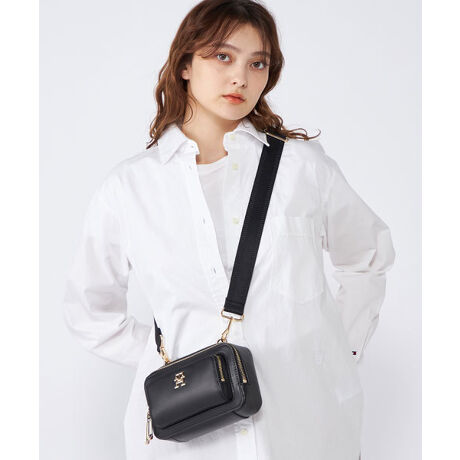 エンボス加工のモノグラムを散りばめたカメラバッグ。メタルのTHロゴとパーツも相まって、リッチな佇まいの一品です。小振りサイズながらメイン収納部と外ポケットに適度なマチ幅があり、見た目以上の収納力を発揮します。コの字型ジップとロゴ入りのスライダーもポイント。日常から旅先まで幅広く活躍します。