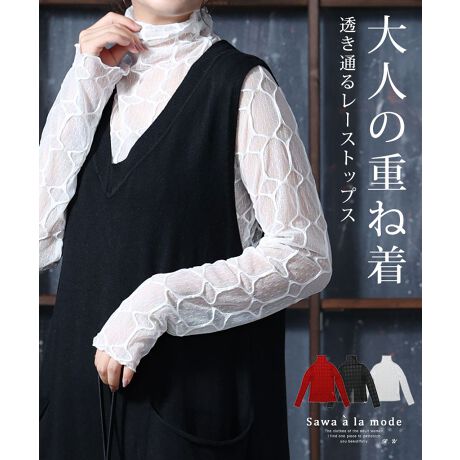 【カットソー】トップス インナー 黒 ブラック 白 ホワイト 赤 レッド 長袖 ハイネック レース