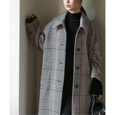 クラシカルな雰囲気のチェック柄を施した、ツィード素材のステンカラーコート。