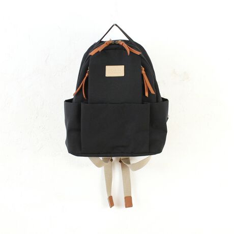 ・13ポケット装備!多収納にこだわった、はっ水リュックが登場。さらりとした手触りで、軽やかなポリエステル・綿混紡素材を使用。表面に汚れや水滴をサッと弾く撥水加工済み!普段のお出かけやレジャーなどで活躍。(※完全防水ではありません。)メインルーム開口部は、側面まで大きく開くダブルファスナー式。内側は程よくマチがあり、B5サイズのノートがすっぽりと収まるサイズ感。タブレットなどが収納できるクッションポケット×1、片マチ仕様のオープンポケット×4、AirPodsなどの小物入れに便利なミニポケット×1付き。フロントにサッと取り出したいパスケースなどの収納に便利な、マグネットボタン式ポケット×1、縦ファスナーポケット×2を配置。サイドからフロントにかけて広がる左右のオープンポケットは、ペットボトルや折りたたみ傘の収納に最適。背面上部にファスナーポケット付き。背面下部にリュックを背負ったままでも小物の出し入れが可能な、シークレットポケットを搭載!メイン直結ファスナーも装備!背面にクッション性のあるメッシュ素材を使用。ムレにくく快適な背負い心地◎ショルダーベルトはクッション性があり、肩への負担を軽減。異素材を使ったフロントのロゴタグ、メインルームやフロントポケットのファスナー引き手がアクセントに♪コンパクトな見た目以上の収納力で、使い勝手抜群!