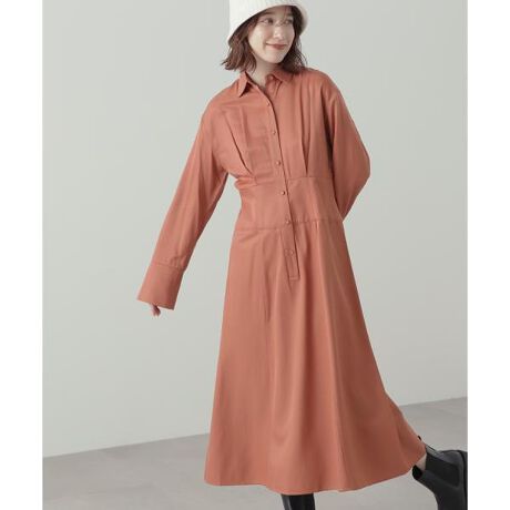 マニッシュな印象のシャツワンピース。上身頃にはタックをいれ、ウエストを幅広で切り替えるなど、1枚でフォルム感のあるデザインに。今季らしいロングカフスデザインもポイントになります。スカート部分はゆるやかなシルエットなので甘くなりすぎず、オフィスシーンにもきちんと感をだせるのでおススメです。