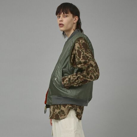 定番のMA-1ジャケットの袖をカットオフし同色のパイピングを施しております。POPなデザインのバッチはお好みの場所に付けられ、程よいアクセントとしてお使い頂けます。