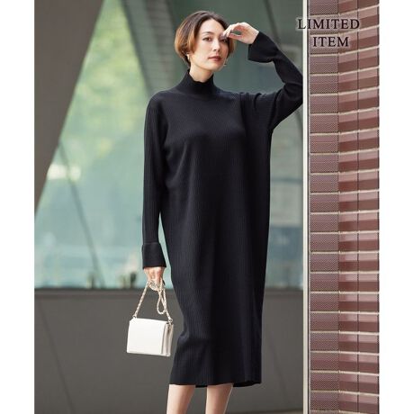 ■デザインIラインシルエットのニットワンピース。綺麗に首に沿ったハイネックと、縦ラインに細く入れた編地がボディーラインをすっきりと見せてくれるデザインです。さりげなく入れた袖口のラッフルがポイントで、コートを羽織ってもほんのり華やかさをプラスしてくれます。ニットならではのリラクシーな着心地ながらも高級感があり、オケージョンシーンにも活躍する一枚です。