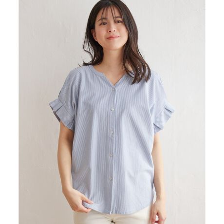 袖のタックフリルとキーネックの組み合わせがポイントのシャツブラウス見えのカットソーです。