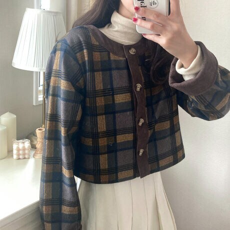 異素材ノーカラーチェックジャケット