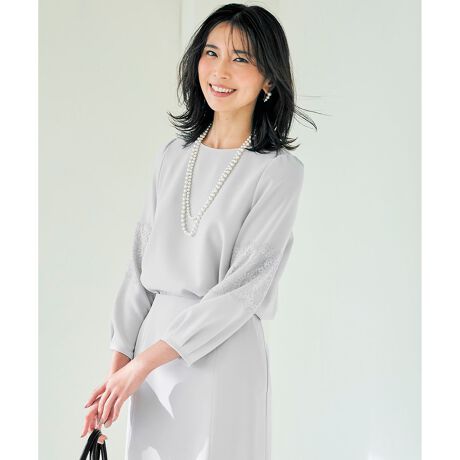 袖にボリュームを持たせたデザインブラウスです。繊細なパーツレースをあしらうことで、スカラの華やかさを楽しんでいただける1枚です。レース部分は透け感が気にならないようデザインしています。袖山のギャザーの分量を調整することで、大人の女性にも着やすい上品なブラウスに仕上がりました。同素材のジャケット・パンツやスカートと合わせていただくとアンサンブルで着用いただけます。ビジネスシーンだけではなく、パールネックレスやブローチを合わせてセレモニーシーン・ご家族行事・七五三・新年のご挨拶にもご対応いただけます。カラーは、肌なじみの良いベージュ系(#033)、シックで洗練された印象のネイビー(#075)、着用シーンを選ばない万能ブラック(#005)の3色展開です。