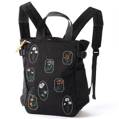 フロントのブローチ刺繍がアクセントになった2WAYリュックバッグ。前面に大量収納ができるポケットや、両サイドには折り畳み傘など収納できるポケットがあります。背面側にはタブレットが収納できる内ポケットがついていて機能性抜群のバッグです。