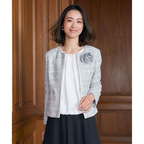 上品なノーカラージャケット。前端の切替部分にサテン生地を取り入れオリジナルのブレードをあしらい、華やかさをプラス。同素材のスカートとセットアップで着たり、シンプルなワンピースに羽織ったりと様々な着回しが可能なアイテムです。どんなアイテムともバランス良くきまる無駄の無いコンパクトなシルエットで、袖は折り返して着られる仕立てにしています。総裏ありです。