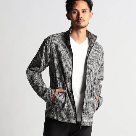 先染めの柄物ガムストレッチ素材を使用したジップアップブルゾンです。合繊ならではのしっとりとした質感と艶感、キックバックの効いたストレッチ性が特徴です。スタンドでも折り返しても着れるコンバーチブルカラーです。春らしくシャツ感覚の一重仕様で、ライダースの様な前振り袖にする事で着心地を良くし、見た目も格好良くなる様に作りました。モノトーンの配色なのでフロントの黒ファスナーに黒のパイピング布を挟み込む事で見た目を引き締め、シャープなシルエットに仕上ています。