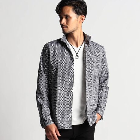 綿とポリエステルを混紡したドビー織りのオリジナルチェック素材の長袖イタリアンカラーデザインシャツです。格子部分は糸が詰まっていますが、平織り部分は薄く透け感のあるシアー素材なので軽い羽織り感覚で着れて、最終加工で吸水速乾効果をプラスしていますのでサラッとした着心地が特徴です。ストレッチ素材ではない為、後身頃と袖口にタックを入れて全体的に少しゆとりを出したサイズ感になります。折り返しても綺麗に着れるコンバーチブルカラー、配色釦や別布をアクセントにしています。