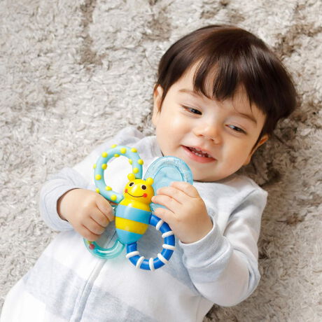 お子様の触覚を刺激する凹凸や、振るたびにカラカラ音がするビーズなど、