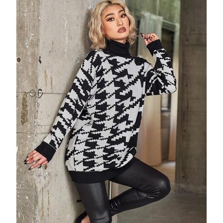 アシンメトリーな大判の千鳥柄が印象的なニットトップス。