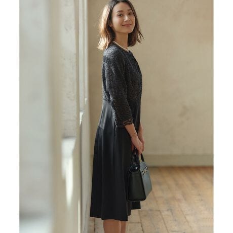 セレモニーシーンで着ていただける、23区定番素材シリーズのワンピースです。上身頃にレースを使用した華やかなフィット&フレア型のワンピースで、襟ぐりにタックを効かせすっきり見せながらも立体感のあるデザインです。ウエスト位置を少し高くすることでスタイルアップも叶います。同素材のジャケットと合わせて、アンサンブルとしても着用頂けます。コサージュやブローチなどアクセサリーを合わせてセレモニーシーン・ご家族行事・七五三・新年のご挨拶にも対応可能です。カラー展開は、シックで落ち着いた印象のネイビー(#075)、着用シーンを選ばない万能ブラック(#005)の2色展開です。