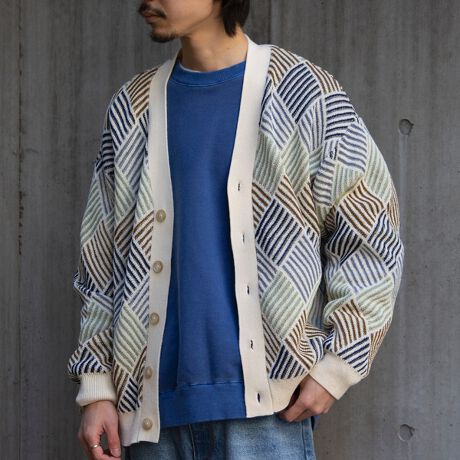 落ち着いたベースカラーにダイヤ柄を採用したトレンド感のあるドロップショルダーのカーディガン。