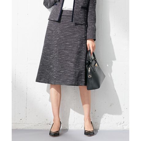 上品な印象のひざ丈セミフレアスカートです。腰回りはすっきりと、裾に向かって広がる女性らしい綺麗なシルエットを表現しています。ラメの光沢感が華やかで、セレモニーなどかっちりとしたシーンにおすすめです。