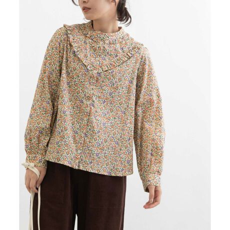 Vカットのヨーク切り替えにフリルをあしらった、レトロな雰囲気のブラウス。程よいサイジングで上品に着られます。春を感じさせる色合いの花柄とベーシックなドットとギンガムの展開です。
