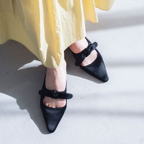 甘くなりすぎない、リボンデザイン。つま先を程よくシャープにし、程よい大きさのリボンをつけることで、甘くなりすぎず、大人な印象に。つま先とリボンの隙間からちらりと足先がのぞくことで抜け感と女性らしさを演出してくれます。