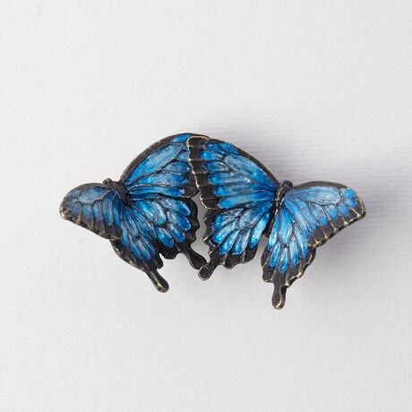 二羽のオオルリアゲハが飛び交う様子を切り取った立体的な帯留め。