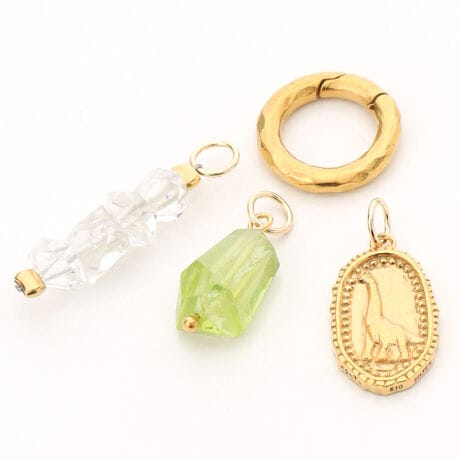 クリッカーとチャーム3点のセット。オーバルのコイン風のチャームにはブラキオサウルス、もう片面にはブラキオサウルスが食べていた植物をイメージした柄になっています。爽やかなグリーンのペリドットとクリアなクォーツと合わせました。開閉式のパーツをチェーンに通して使うネックレスチャームです。パーツが開閉するので、いつもはチャームを通せない大振りなネックレスにも取り付けることが可能です。セットのミニチャームは1つずつピアスチャームとしてもお使いいただけます。※天然石や天然素材を使用している為、サイズ・色味・風合いの違いや、若干の傷、内包物の有無などに個体差があります。予めご了承ください。