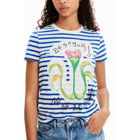 フロント部分にアーティなパッチ、メッセージの刺繍とバック部分にイラストを組み合わせた、ストライプ半袖Tシャツ。