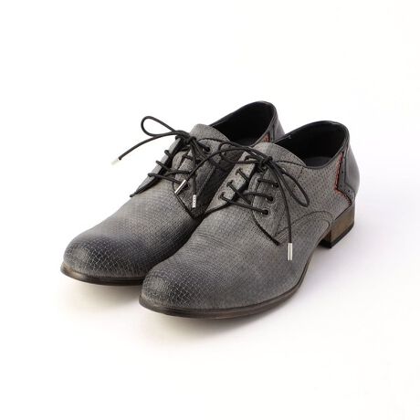 細かいイントレ(編み込み)調のエンボス加工を施したヌバック調合皮とデニム素材を採用したプレーントゥシューズです。エンボス加工による凹凸感にアンティーク調の仕上げを施して雰囲気を出す様に仕上げました。長過ぎず、丸過ぎず、トゥスプリングの効いた綺麗なシルエットが特徴の木型(ラスト)を採用しています。かかと部分にはスムースレザーを使用しアクセントにています。ステッチワークなど各所細部にまで拘っています。ナチュラルなウッド調のソールは反り返りも良く、軽さを感じます。シューレースはゴム紐と従来型の2本付けているので好みに合わせて変えて下さい。