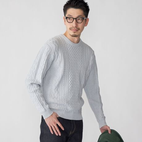 絶妙なバランスで施されたフィッシャーマンパターンが特徴的な9Gのクルーネックニット。