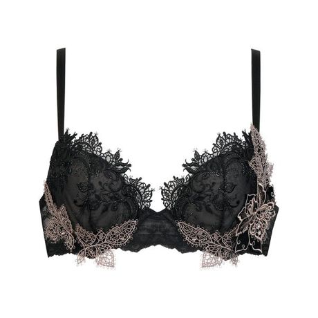 ●胸の谷間を美しく、自分に合わせてととのえる 前中心の低いワイヤーを使い、脇寄せを強くすることで、胸の谷間を美しく見せる●サイズにあわせたバストメイクを (C〜E)カップ…NEWピタッとパッド付き (E〜G)カップ…サポートパネル付きでバストの脇流れを防ぐ (G)カップ…ボリュームをささえる下カップボーン付き●ゴージャスに、繊細に、気品を纏って 異素材を組み合わせた立体アップリケがポイントのデザイン アップリケにはクリスタル付き