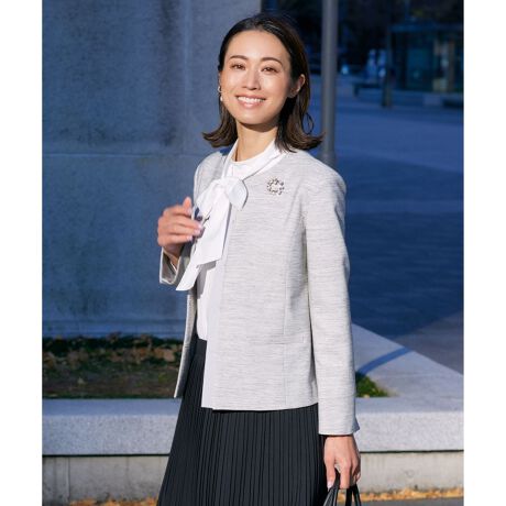 オケージョンシーンはもちろん、お出かけなど様々なシーンで活躍してくれる華やかなノーカラージャケット。すっきりとしたシルエットで、同素材のスカートと合わせた際にバランス良く着られるよう着丈にもこだわりました。スカートとセットアップでも単品でもお使いいただける汎用性の高いアイテム。表情のあるツイード素材なので、シンプルなインナーやスカートに合わせるだけでスタイリングが華やぎます。袖口にはベントを入れているため袖を折り返すこともでき、季節やインナーに合わせてお好みの袖丈に調節していただけます。総裏ありです。