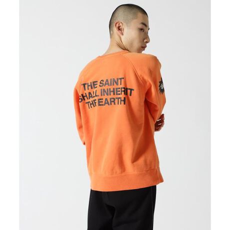 ビビットなオレンジのコットン地をベースに、前身頃にミルクパックがモチーフのオリジナルグラフィック、後身頃にレタリングロゴ、両スリーブに双方のブランドネームを掛け合わせた”SAINT TEARS”ロゴをプリント。
