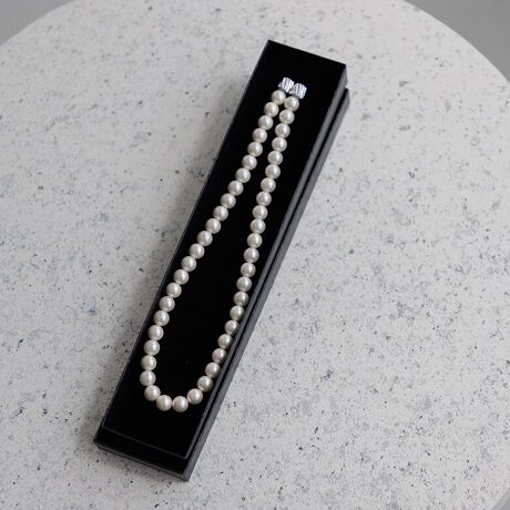ネックレスは着脱が便利なマグネット式です。核に貝殻(かいかく)を使用し、感触・硬さなど、真珠の核に限りなく近い品質のパールです。