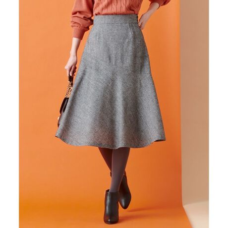 ■デザインコートを羽織っても着映えする、チェック柄とツイード調のフレアスカートです。アシンメトリーなパネル切り替えデザインと、フロントのイレヘムデザインがポイントになっています。腰周りはすっきりと、裾に向かってフレアが出るシルエットになっており、上品な印象で着用していただけます。後ろウエストはゴム仕様で快適な着心地になっています。