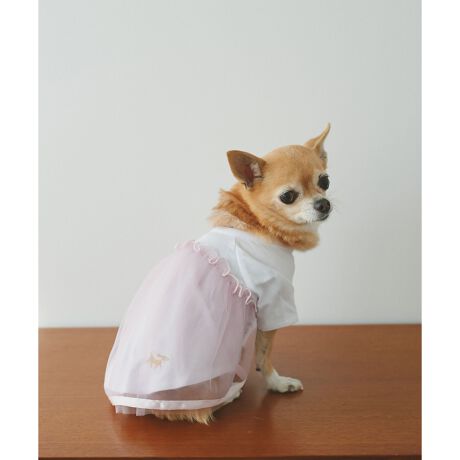 ・カットソーにチュールワンピースを重ねたような、フェイクレイヤードデザインのドッグ用ワンピース。