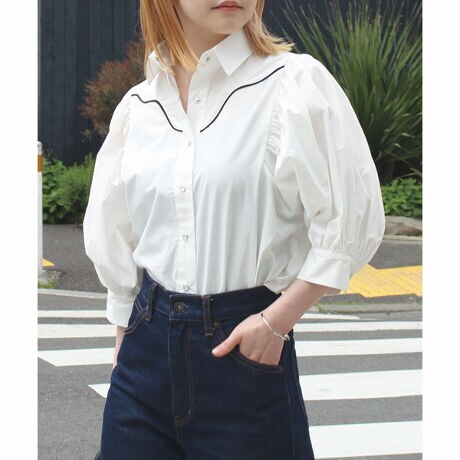 ウエスタンディテールを取り入れたパイピングデザインがポイント。ゆったりとしたパフスリーブが二の腕をカバー、襟付きなので甘くなり過ぎず大人の女性も着やすいデザインです。